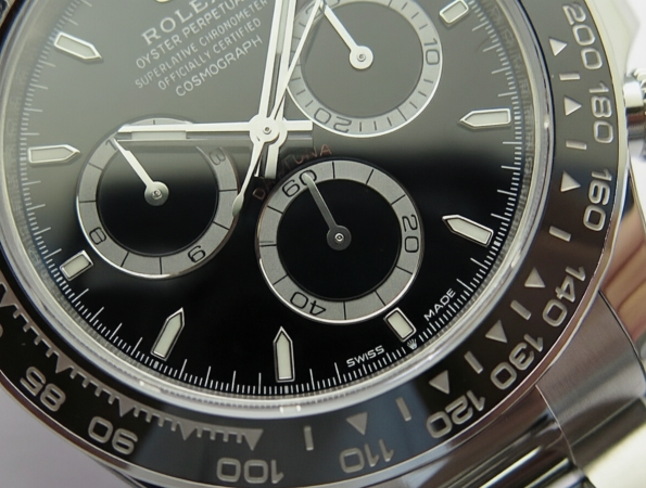 • Bezel: Black ceramic tachymeter bezel with stainless steel outer wrap — highly scratch-resistant, UV-stable, and precisely engraved for accurate speed calculation